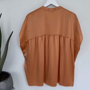 Gorgeous silk satin blouse with shirring on the back yoke and around the neckline. Photos don't do the colour justice- it's a stunning, lustrous coppery tone.