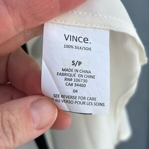 Elegant Vince silk blouse. High low hemline, deep V with black accented front.