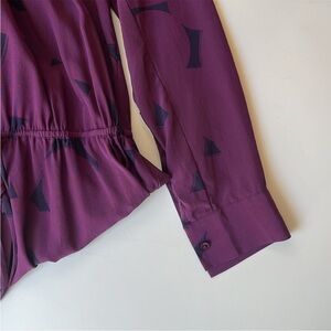 A fluid silk maxi dress from Vince in a rich plum base with abstract navy geometric print. The silhouette is relaxed yet refined, with a band collar neckline, hidden button placket, and long sleeves with button cuffs. A drawstring waist lets you adjust the shape to your liking, while the skirt falls effortlessly with side slits for movement. Made from 100% silk, it feels lightweight and drapey, perfect for dressing up or down.