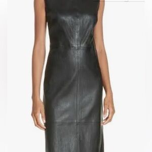 Black polyester dress with leather detailing (strip on sleeves and back zipper). Lined. Front "kangaroo" style pocket. Great condition.