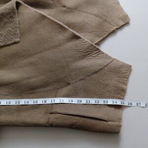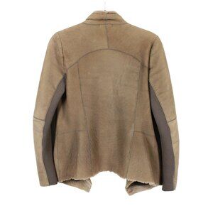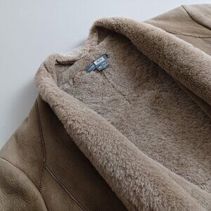 A gorgeous jacket in a neutral tan colour. The shearling material is so soft and cozy. The tailored stitch detailing adds refined structure and a flattering fit. The ribbed panels on the inner side of sleeves provide ease of movement and comfort. Perfect for spring and fall. Like new, excellent condition.