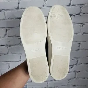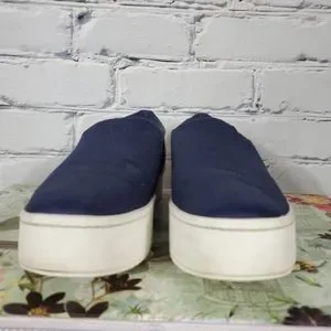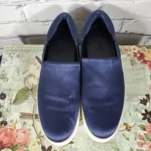 The Warren shoes from Vince are a slip on style sneaker with a rubber platform sole. They have a deep blue satin upper with elastic gussets at the sides. They are prleoved with some wear at the sole.