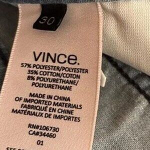 A pair of casual chambray denim jogger pants from the brand Vince. These pants have mid-rise waist, a zipper fly with a button closure, and front slash pockets. The style is a jogger with elasticized cuffs at the hem. They are made from a blend of polyester, cotton, and polyurethane, giving them a lightweight feel and a chambray jogger style.