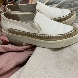 Stylish white slip-on espadrille sneakers with a comfortable fit. Soft footbed. Light scuffing on bottom and one blue mark. A fabulous pair