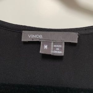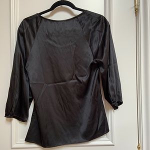 Vince black satin blouse features a scoop neck collar and pleat detail. 3/4 length sleeve. Size M. In Excellent condition. Material 95% silk, 5% spandex