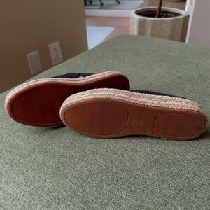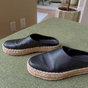 Black leather slide on shoes with woven base. Like-new condition (worn only once).