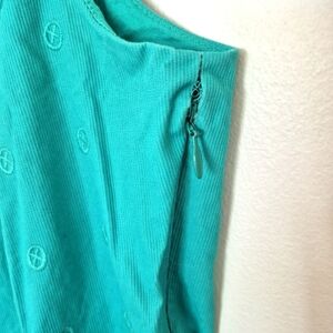 Vibrant green sleeveless dress featuring delicate allover eyelet embroidery and an intricate floral scalloped hem. Made from 100% cotton shell and lining for a breathable, quality feel. Designed with a flattering fitted bodice, gathered skirt, and convenient side pockets. Includes a concealed side zipper (note: seam near zipper is slightly imperfect, see photo). Perfect for summer outings, garden parties, preppy nautical looks, or casual events. Dry clean only.