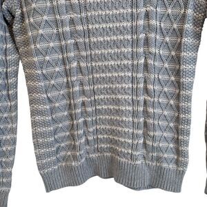 In excellent condition. Vineyard Vines grey and white striped cable knit sweater. Preppy and classic in 100% cotton. This crewneck is a great casual piece that can be worn season to season. Flat lay measurements: 18" pit to pit, 24" length.