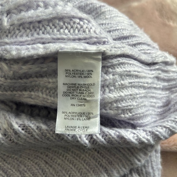 Elegant lavender turtleneck with intricate cable knit design. Soft and warm for any season. Slightly cropped. Size small. Good, preloved condition.