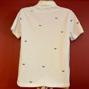Vineyard Vines Men's All Over Whale White Pique Polo - Size XS - Overall good preowned condition, but there is one faint blue mark on back by bottom hem. Short sleeved. Chest: 37". Length: 26" (front back of neck hem to bottom hem)