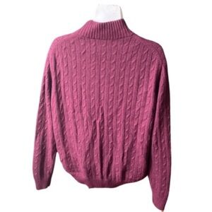 DESCRIPTION: VV soft and stylish burgundy wool cashmere blend 1/4 zip. Cable knit. High neck. Chest logo. Wear alone or under a blazer for upscale casual look