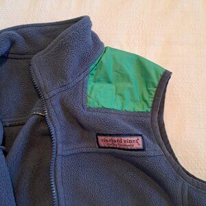 Vineyard Vines boys or girls Large 16-18 light blue fleece vest, well loved, 2 front zippered pockets, A few popped stitches pictured on the bottom elastic trim, green shoulder trim, normal fleece wear, good overall condition, GUC