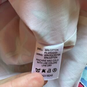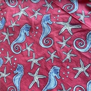 How cute is this! Coral base colour with seahorses and starfish. Size 6. When laying flat waist is15.5”, length is 17”. Cotton / spandex blend. Lined.