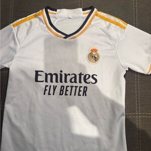 This Vinicius Jr. Real Madrid soccer jersey features a classic white design with gold accents. Perfect for young sports enthusiasts.