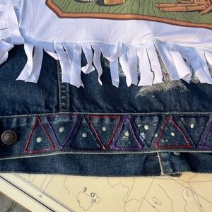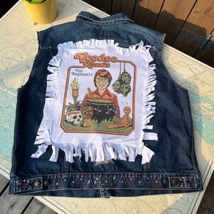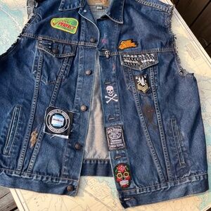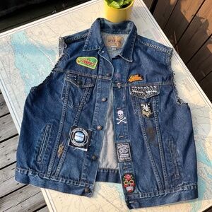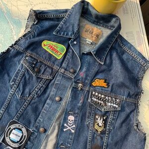 Vintage 00s GAP customized cut off jean vest. Patches, paint, and pins all make this a one of a kind piece! Back has a crudely sewn on Steven Rhodes graphic, expletives hidden under the collar. Some pieces are covering others, some have been removed, see photos for details. Tagged as a XXL, Measures approx. 19" across shoulders, 24" pit to pit, 28" long.