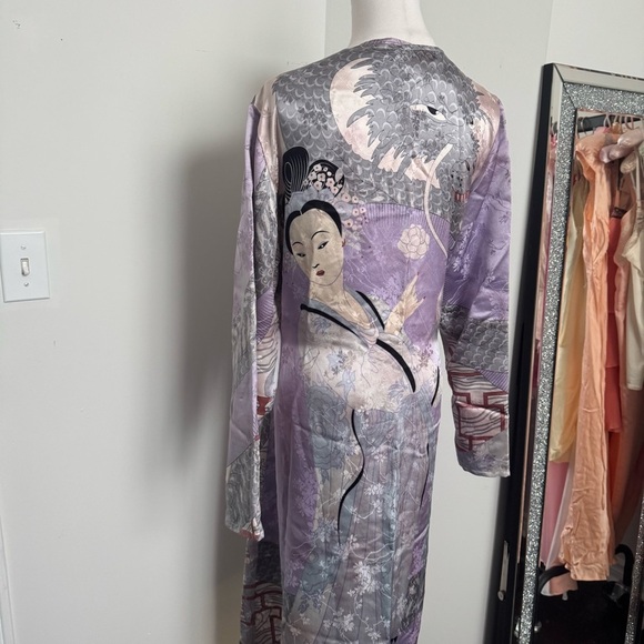 Vintage 100% Silk Kimono Robe Duster w Print japanese dragon geisha XL lavender