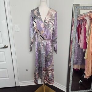 Elegant silk kimono robe. Features a beautiful artistic print. Perfect for lounging or as a statement piece.