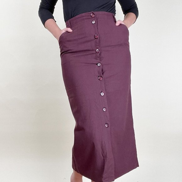 Vintage 100% Silk Midi Skirt Column Straight Cut Slit High Rise Waist Button Up