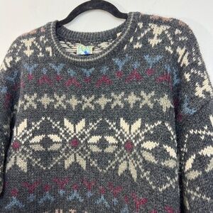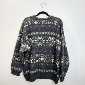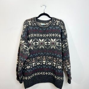 Vintage 100% wool grey fair isle knit pullover crew neck ski sweater L