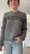 Grey v neck wool sweater. Ribbed detail on cuffs, hem, and neckline, pattern going across chest and onto the sleeves. The grey has a heathered look rather than being one flat colour throughout. Thick, made in Canada, perfect for ice fishing or relaxing after a day of skiing ⛷️
