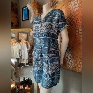 Stylish and comfortable 100% Silk blue and white patterned jumpsuit from Stunt Petite, perfect for any occasion. Features a unique abstract design that stands out. Vintage item from 1990s, purchased from reputable vintage seller here on poshmark! Button Down with short sleeves. Shorts are pleated with front pockets and elastic waist.