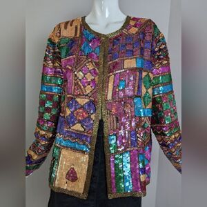Incredible vintage all-over sequin jacket on 100% silk. Covered in vibrant geometric patchwork patterns in jewel tones — purple, green, gold, teal, pink, and copper. Features hook-and-eye front closures and a soft boxy silhouette. Fully lined. A rare, head-turning piece perfect for parties, holiday looks, or collectors of vintage glam.