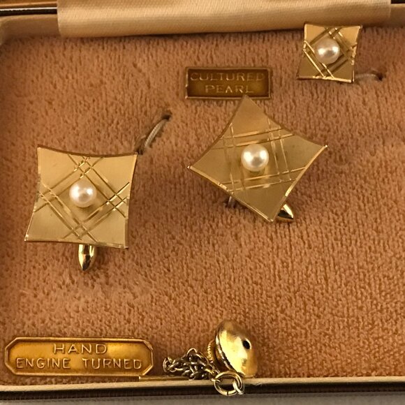Vintage 1/20 14K G.F. Cufflinks and Tie Pin Hand Engine Turned Cultured Pearl