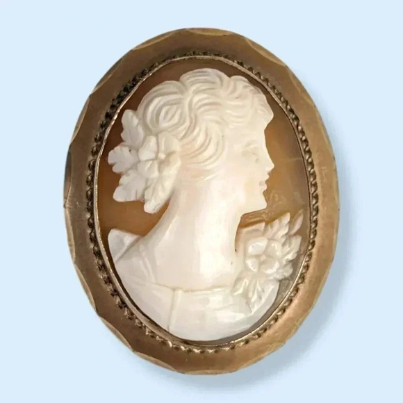 This beautiful pendant features a shell cameo of a beflowered woman looking to the right. The metal frame is 12 karat gold filled and is full of small design details. The back of the brooch has a locking c pin closure and a bail, allowing the brooch to be worn as a necklace. The back of the shell is also open and visible. The back of the pendant is stamped MA near the top, and the bottom is stamped "12012k" and another MA (1/20 12k GF).