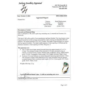 The vibrant green hue of the emerald is beautifully complemented by a halo of 14 full-cut diamonds,