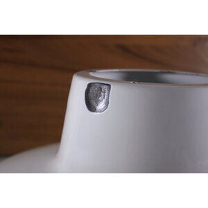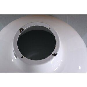 This shade is in a classic factory shape, in white enamel upper and white enamel inner. It is in perfectly worn vintage condition with numerous spots of damage: there are 2 larger spots on the outside of the shade, numerous chips off the rim and a couple of spots on the inside of the shade. (see images)