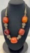 Authentic vintage necklace from the 1930s featuring richly colored, chunky Bakelite beads in warm amber and deep cherry tones, tested and verified. Each bead is separated by intricately detailed silver-tone filigree spacers with a tribal/ ethnic design influence. The necklace is finished with a unique conical metal end cap and a secure hook clasp. A statement piece with old-world charm, perfect for collectors or vintage fashion lovers.