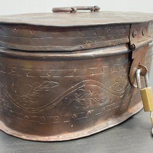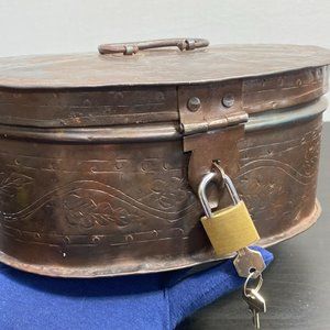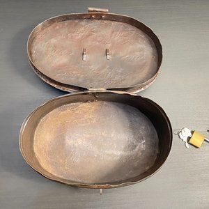 Vintage 1930s Era Metal Tin, Oval Floral Tool Box Case with lock and key Decorat