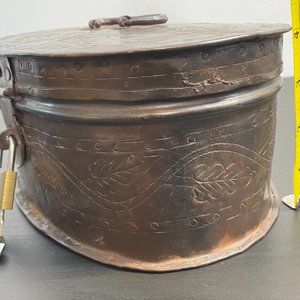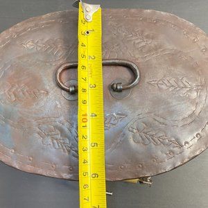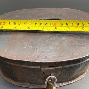 This vintage 1930s era metal tin is a captivating oval floral tool box case that exudes timeless charm and character. Crafted with exquisite attention to detail, it harkens back to an era of elegant craftsmanship. The tin's surface features a delicate floral pattern, adding a touch of sophistication and nostalgia to any space.
