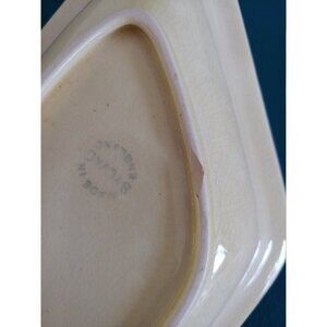 A pair of lozenge shaped pottery or ceramic nesting dishes by SylvaC, made in England, dating from the late 1930´s. The edges have been decorated with blackberries (brambles) and a very art deco looking step edge. The glazing is a soft yellow / off white with plenty of crackling to it, especially inside the bowl. The two dishes fit nicely inside each other. Both bowls are stamped in ink ´Made in England, SylvaC and relief stamped ´1861 Made in England´