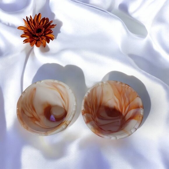 This charming vintage Akro Agate slag glass set includes two beautifully crafted cups/vases in striking rusty orange and cream swirls. Featuring fluted edges and a raised side design, each piece measures 3.5" high, with a 4" mouth and a 2" base, stamped "Made in USA 296" on the bottom. Likely produced in the 1930s–1940s, these vases are in good vintage condition, free from chips or cracks, with only minimal wear. Some roughned areas on the outsidePossibly from adhesive.