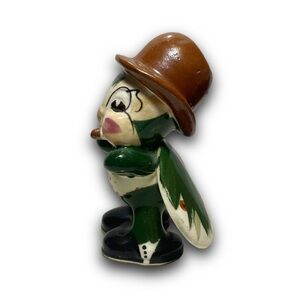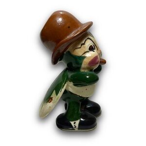 Vintage Anthropomorphic Cricket Bug with Cigar Ceramic Figure from the 1940s, made in Japan. This charming figurine features a small size, glazed finish, and vibrant hand painted multicolor design. Perfect for collectors of Bugs and Animals, this original piece adds a whimsical touch to any room. Ideal for all occasions, this 1940s style figurine is a must-have for those who appreciate unique and nostalgic decor items. Manufactured between 1945-1951 in occupied Japan. No chips or cracks.