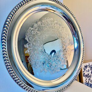 Vintage 1940s Oneida made exclusively for Lewyt silverplated serving tray. Freshly polished but could use some more on the trim! Scratches as shown in photos. Diameter is 15 inches. Cat friendly, nonsmoking home.