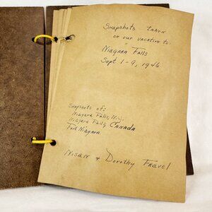 This is a really nice collection of snapshots, photos and clippings. From Niagara Falls September 1-9, 1946. There are some photos of Niagara. There are 65 black and white photos about Niagara Falls N.Y., Niagara Falls Canada, Fort Niagara and some newspaper clippings about the Falls. It is a nice little piece of history.