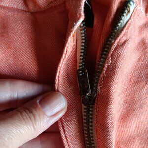 The zipper is stained in spots and the pull is rusted. There is rust stain and wear where it lies against the fabric on the interior, however this does not affect the exterior fabric. There is some wear in the fabric on the exterior side (unrelated to the zipper). There are a few pulls in the fabric, some wear at the bottom of the inside of the leg, and a break in the stitching at the hem. There is a faint yellowish stain on the front bottom left leg and there are pinkish stains that almost look like more concentrated areas of orange. Please see all photos. Measurements taken lying flat: