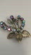 Lovely Vintage Brooch with Blues and Pinks AB Stones. In Excellent Condition. Circa late 1950's. Measures 2" by 2". AB stones are prong set Gold Tone textured leaves.