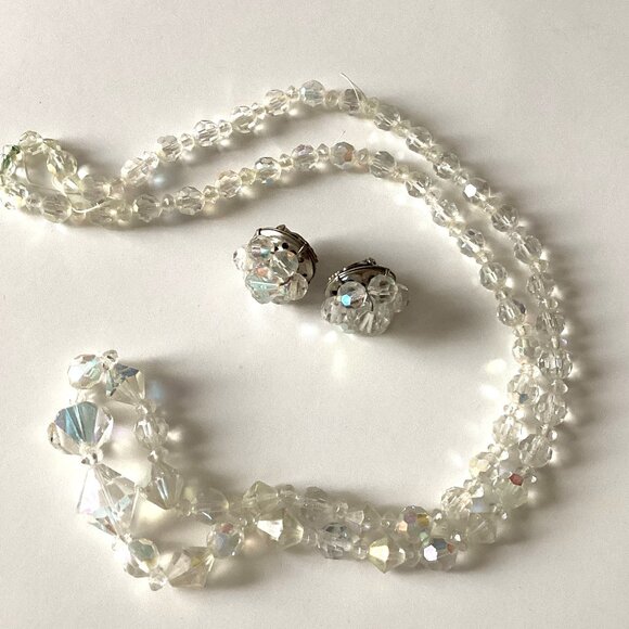 Vintage 1950s Aurora Borealis Necklace & Clip on Earrings Retro Y2K