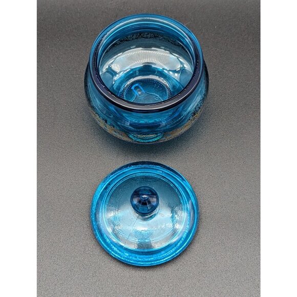 This beautiful vintage 1950's vibrant blue jar with lid and gold gilding decorative exterior is a stunning piece to your collection. Primary material is glass and the craftsmanship and attention to detail are evident in the gold gilding and base. No chips or cracks as seen in photographs.