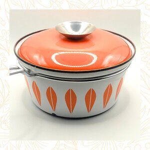 A lovely pan with steel handle in enamel - and with lid - From the Norwegian company - Cathrineholm - Made in Norway 1950`s. It is made in enamel and is in base white with orange flower - From the Lotus design. Some enamel loss and light staining inside due to age of piece (see photos), but still an excellent piece for display.
