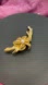 A sweeping, stylized ribbon or leaf stem design extends below the flower, accented with clear, sparkling rhinestones for a touch of glamour. The rich gold tone finish and intricate craftsmanship give this brooch a classic,upscale look.