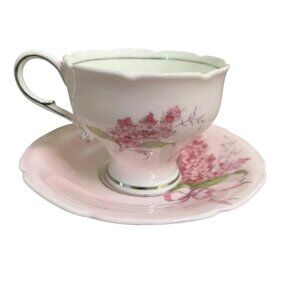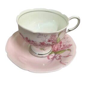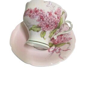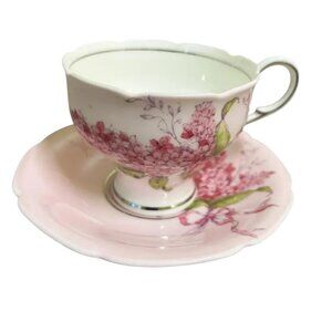 Vintage 1950s Paragon lilac tea cup and saucer. Pink lilacs with ribbons on beautiful pink background.