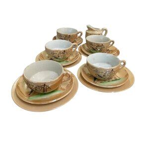 Lovely peach lustre ware children's dishes. Stenciled and hand painted bluebirds in blossom trees. Made in Japan.