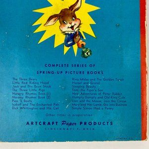 These vintage 1950s hard cover pop-up books "The New Adventures of Peter Rabbit" and "Goldie the Goose that Laid the Golden Egg" are two of a series of "3 Dimensional Spring-Up" books published by Artcraft Paper Products, Cincinnati, Ohio. There are five thick pages with pop-ups, all in very good condition.