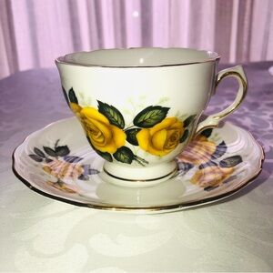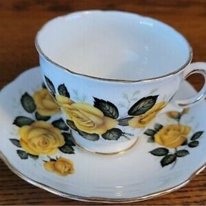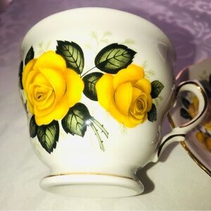 Beautiful teacup and saucer with yellow rose design. Gold accents add a touch of elegance.