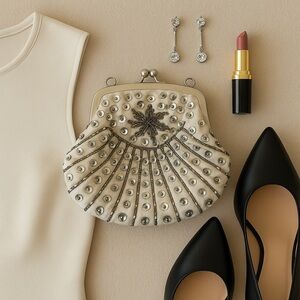 Includes side loops for attaching a chain (not included) if you’d like to wear it as a shoulder bag. A rare, glamorous piece perfect for weddings, formal events, or collectors.