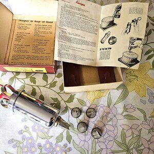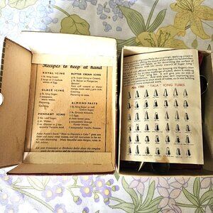 Vintage from 1950s or 60s, metal icing tube set with different end nozzles, instructions, original box. Tube and ends stamped Tala Made in England.